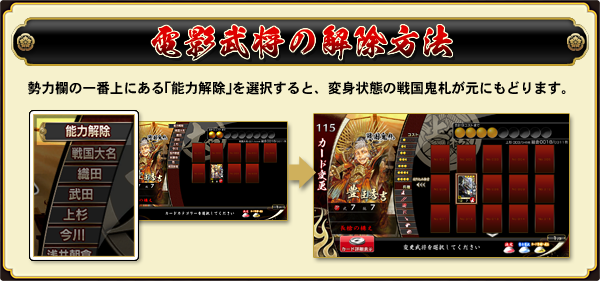 スターターパックに入っている戦国鬼札を電影武将に変身させることができます。